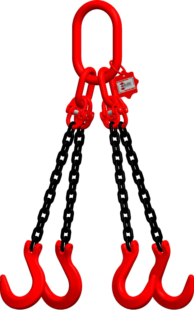 Řetězový 4-závěs s s háky slévárenskými CYF16 d 16/délka L dle výběru (d=průměr drátu řetězu v mm) - s nosností 17000/11800 kg (0-45°/45-60°) - dle EN 818-4. V případě požadovaného provedení vázacího řetězu se zkracovači, vyberte dle typu v Souvisejícím zbožím. Vybrané typy zkracovačů budou osazeny na Vámi zvolený vázací řetěz.